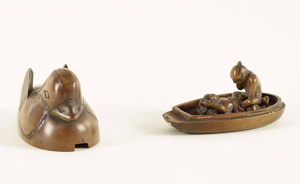 Netsuke: Mandarinente, im Inneren ein kopulierendes Liebespaar