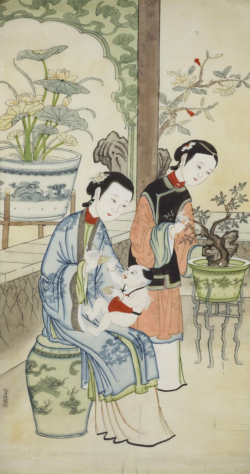 Wohlhabende Frau mit Kleinkind und Dienerin auf der Terrasse ihres Hauses