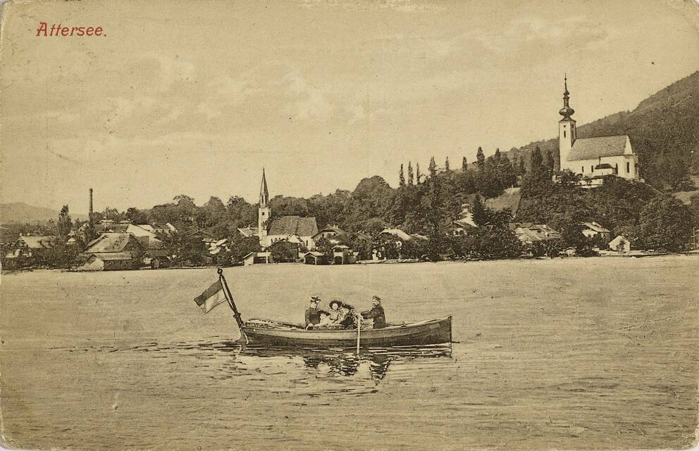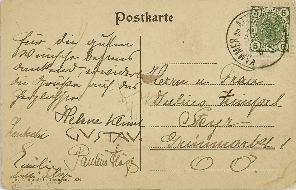 Postkarte von Helene Klimt an Ehepaar Zimpel, auch unterschrieben von Gustav und Helene „Lentschi“ Klimt, Pauline und Emilie Flöge, (Attersee.)