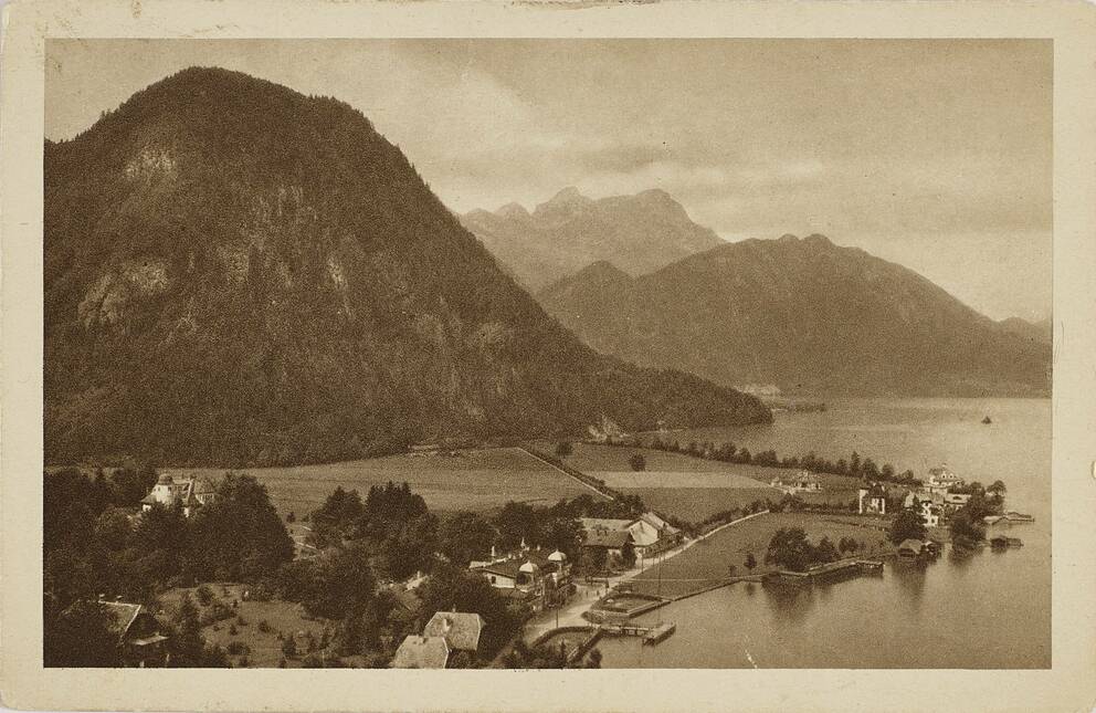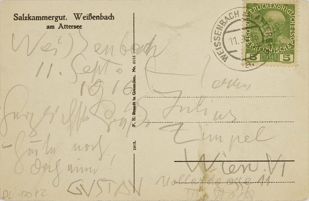 Postkarte von Gustav Klimt an Julius Zimpel in Wien „Herzlichsten Gruß …“, (Salzkammergut. Weißenbach am Attersee)