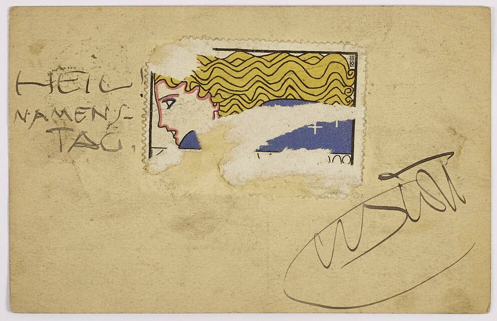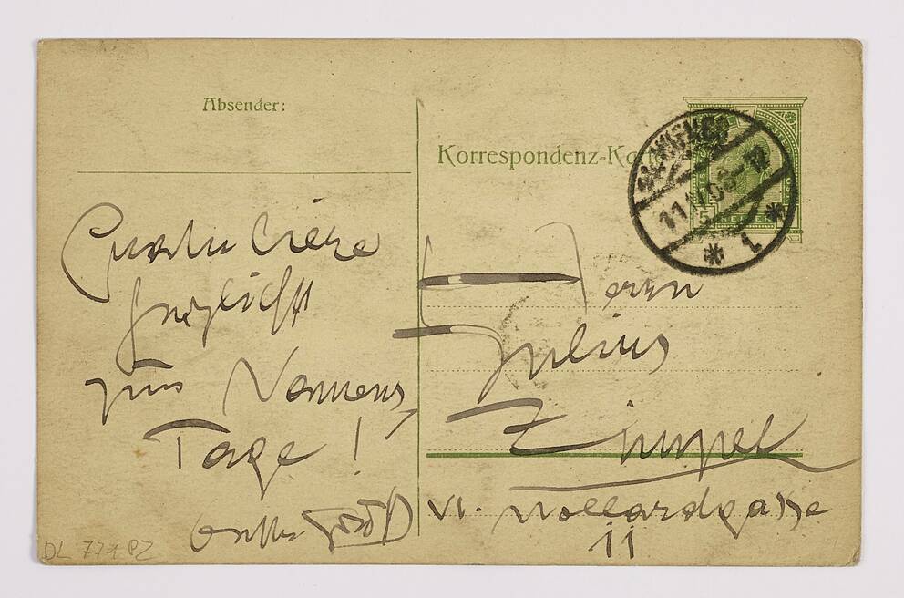 Korrespondenz-Karte von Gustav Klimt an Julius Zimpel “Gratuliere herzlichst zum Namenstage …“