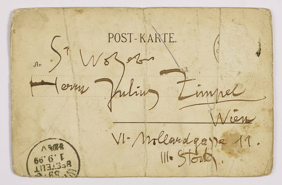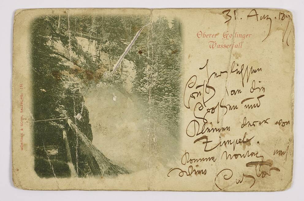 Post-Karte von Gustav Klimt an Julius Zimpel in Wien „Herzlichen Gruß an die Großen …“, (Oberer Gollinger Wasserfall)