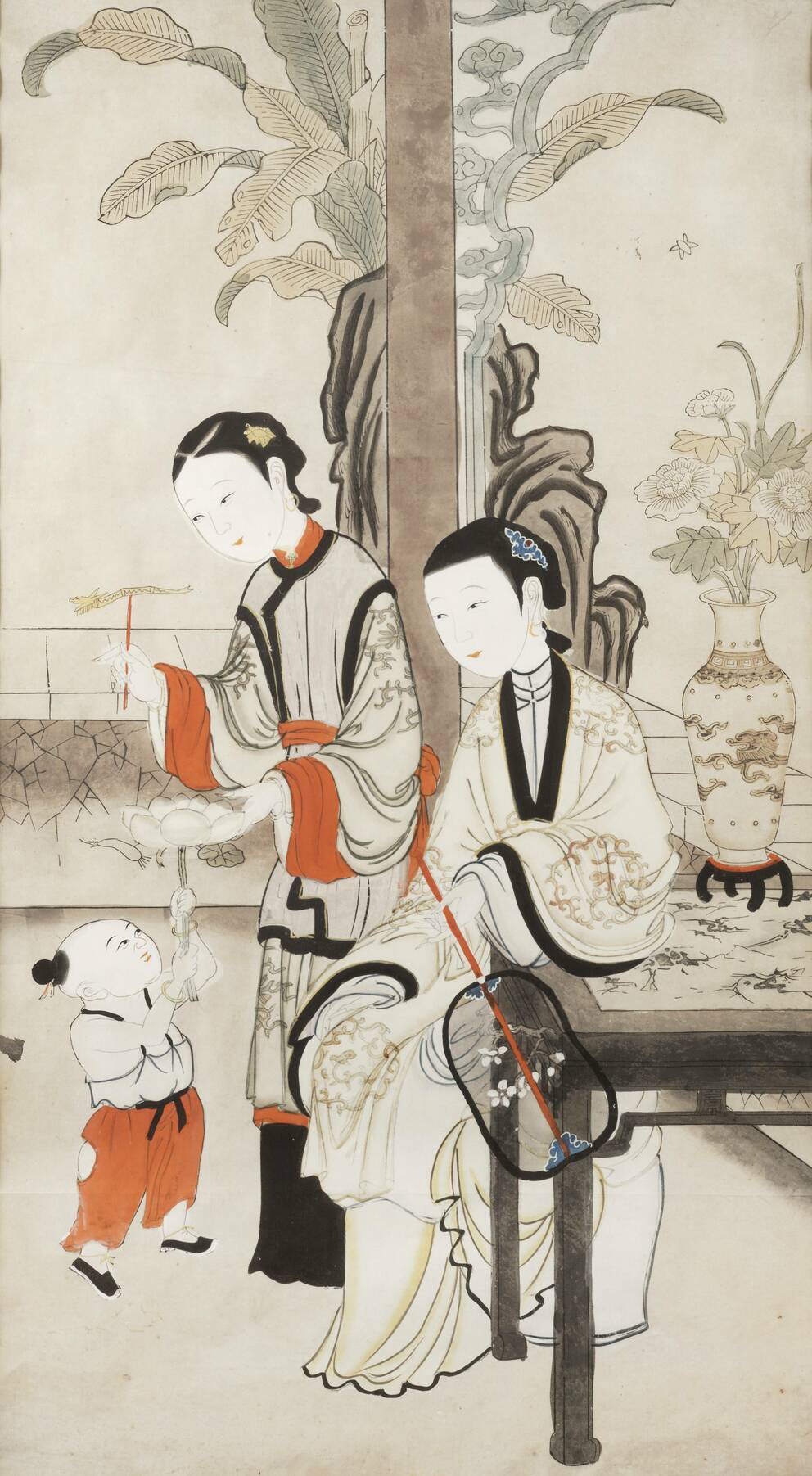 Wohlhabende Frau mit Kleinkind und Dienerin auf der Terrasse ihres Hauses