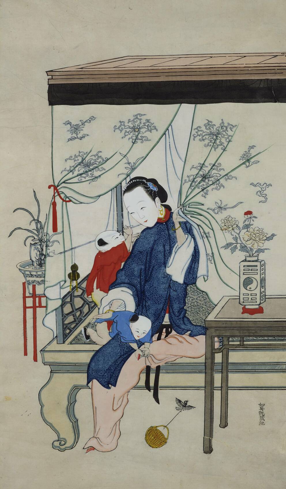 Wohlhabende Frau mit zwei Kleinkindern in ihrem Schlafgemach